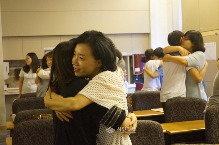 지난 23일 경기 안성시의 부모·자녀간 소통 프로그램인 '부모와 함께 하는 비전캠프 내 꿈을 찾아서'에 참가한 모녀가 서로를 안은 채 대화를 하고 있다. (사진제공=안성시청)