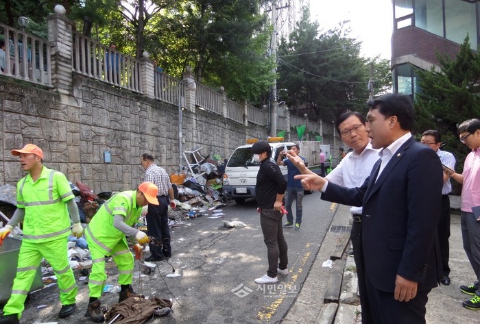 | ▲ 전 의원이 청소가 진행 중인 노량진1동 우성아파트 인근도로를 방문해 상태를 살펴보고 있다. | ||
