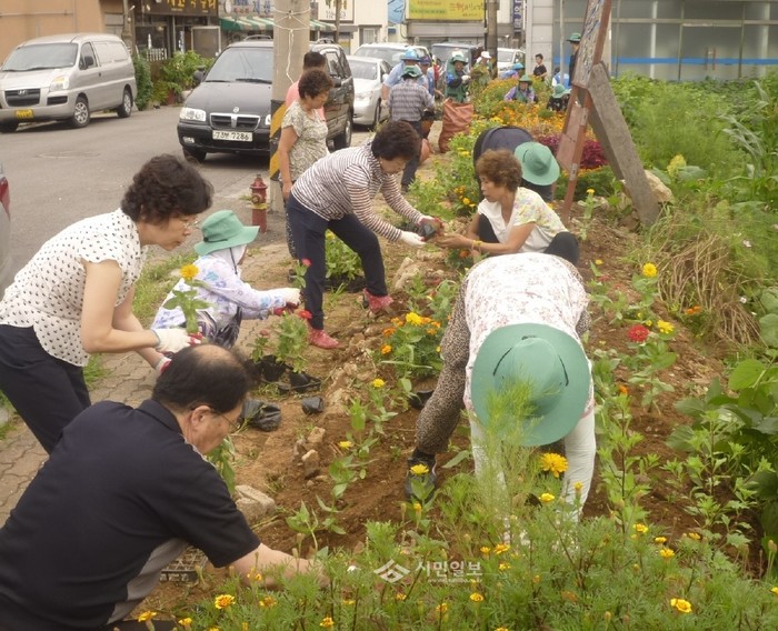 지난 25일 인천시 동구 금창동 주민자치위원과 주민·환경지킴이들이 산업도로 부지 주변과 주민센터 입구 등 지역내 자투리땅에 '우리 동네 가꾸기 행사'의 일환으로 백일홍 500여본을 식재하고 있다. (사진제공=동구청)