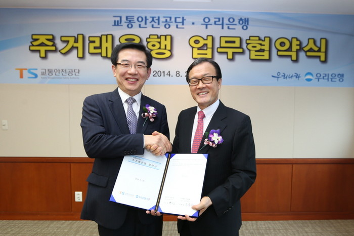 | ▲ 26일 우리은행 본점에서 이순우 은행장(사진 오른쪽)이 정일영 교통안전공단 이사장과 주거래은행 업무협약을 체결한 후 기념촬영을 하고 있다. | ||