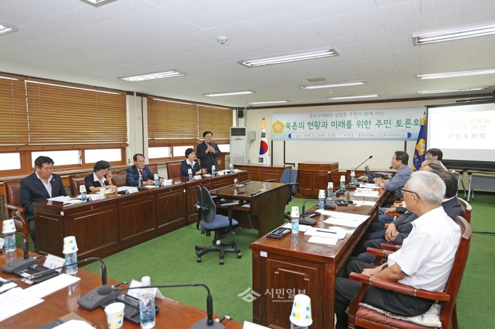 | ▲ 김복동 종로구의회 의장이 ‘북촌의 현황과 미래를 위한 주민토론회’에 참석해 주민들과 북촌문제에 대해 토론을 하고 있다. (사진제공=종로구의회) | ||