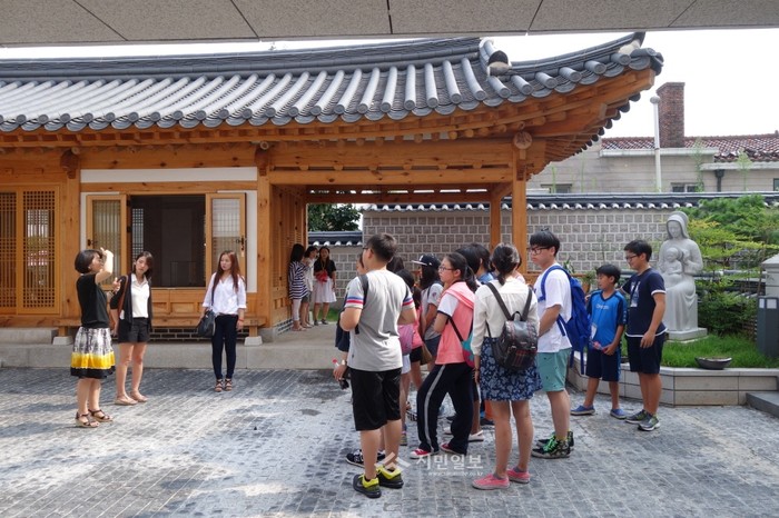 | ▲ 구에서 운영하고 있는 '천주교 순례지 팸투어'에 참가한 학생들이 가회동 성당에서 성당의 역사에 대해 설명을 듣고 있다. (사진제공=종로구청) | ||