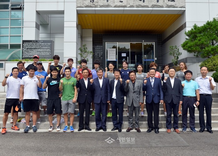 27일 경기 동두천시는 태릉선수촌을 방문해 동두천시청 빙상단 소속 스피드스케이팅 국가대표 선수단을 격려했다. 사진은 이날 태릉선수촌을 방문한 오세창 시장과 기념촬영 중인 선수들의 모습. (사진제공=동두천시청)