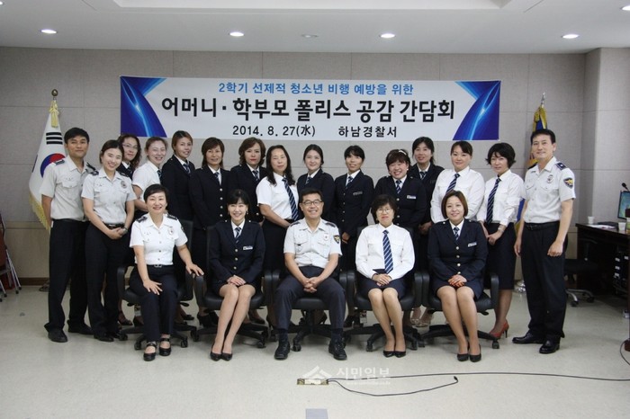 하남경찰서는 27일(수요일) 서장을 비롯한 어머니폴리스, 학부모폴리스 임원진 20여명이 참석한 가운데 지역내 학생 안전망을 구축 및 선제적 학교폭력 예방을 위한 간담회를 열었다. 사진은 어머니·학부모폴리스 봉사자들과 함께 간담회 후 기념촬영을 한 모습. (사진제공=하남경찰서)
