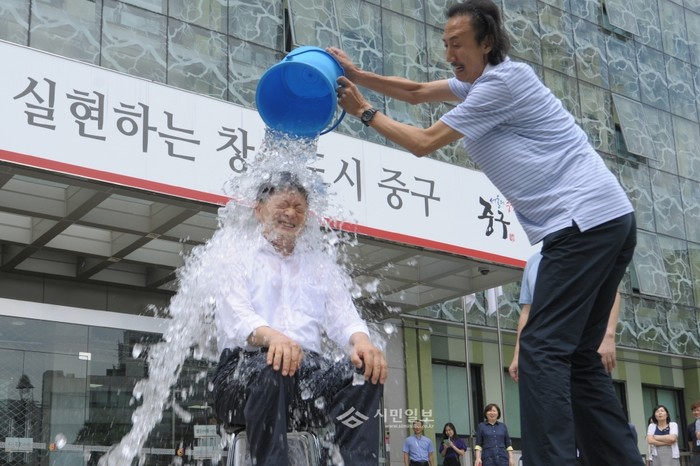 지난 26일 최창식 서울 중구청장이 중구청 앞 광장에서 한 사람이 머리에 얼음물을 뒤집어쓰거나 미국의 ALS 협회에 기부하는 방식으로 진행되는 '루게릭병 환자를 위한 아이스버킷 챌린지' 참여를 위해 얼음물을 맞고 있다. (사진제공=중구청)