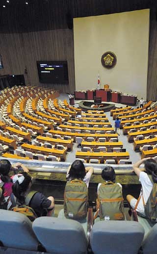 세월호특별법 제정을 두고 정국이 대치 중인 가운데 27일 오전 서울 여의도 국회에서 학생들이 비어 있는 본회의장을 보고 있다.