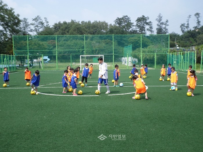 최근 야외 체육활동을 자주 접하지 못하는 유아들의 신체 발육발달 촉진 및 협동심, 인지능력 등의 적응력 향상을 위해 서울 은평구가 실시하고 있는 ‘2014 하반기 은평구 유아축구교실’에 참가한 아이들이 증산동 생활체육광장내 풋살경기장에서 축구를 배우고 있다.(사진제공=은평구청)