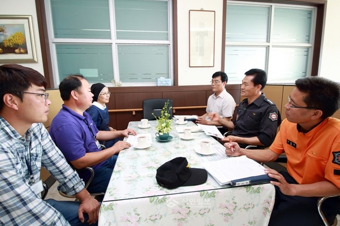 지난 27일 류환형 인천강화소방서장(오른쪽 가운데)이 추석을 앞두고 '관서장 지도점검'의 일환으로 지역내 노인요양시설 '성안나의 집'을 방문해 시설 관계자들에게 소방시설 점검 등을 당부하고 있다. (사진제공=강화소방서)