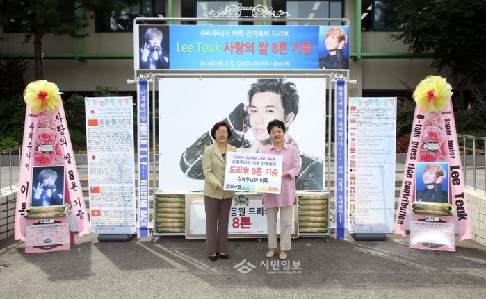 지난 27일 서울 강남구청에서 30여개 나라의 팬들이 슈퍼주니어 이특의 군전역 축하선물로 보낸 쌀 화환 8톤을 이특 어머니 류숙영씨(오른쪽)가 신연희 서울 강남구청장(왼쪽)에게 전달하고 기념촬영을 하고 있다.(사진제공=강남구청)
