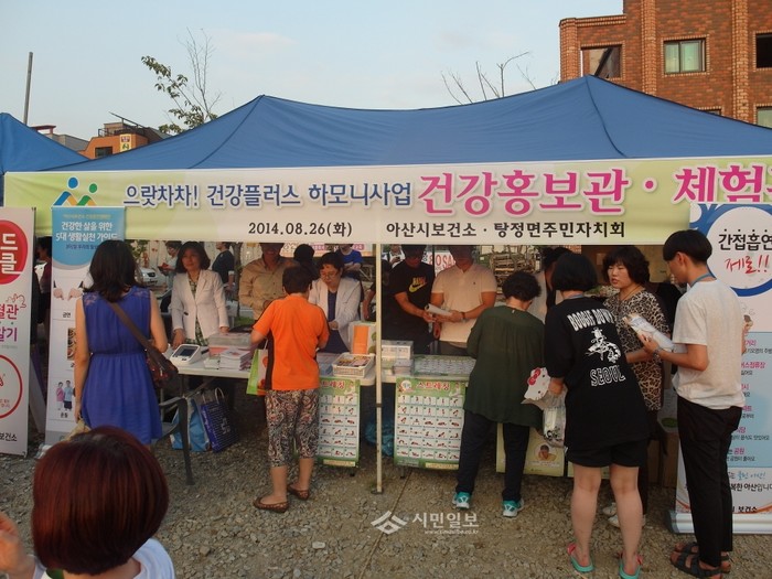 지난 26일 충남 아산시 보건소가 탕정면사무소 인근에서 금연구역을 홍보하고 일산화탄소 측정, 스트레칭 방법, 올바른 칫솔질법과 알코올 의존도, 음주가상 체험 등의 내용이 포함된 '으랏차차! 건강플러스 하모니 사업 건강홍보관'을 운영했다. 사진은 홍보관을 방문한 주민들의 모습.(사진제공=아산시청)
