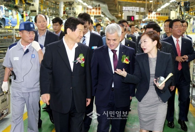 한국지엠은 27일, 세르지오 호샤 (Sergio Rocha) 사장, 박상일 한국지엠 노동조합 창원지회장 등 임직원과 안상수 창원시장, 최충경 창원상공회의소 회장 등 창원시 관계자 등 120 여명이 참석한 가운데, 창원시의 ‘다마스, 라보 생산재개 기념식’과 ‘한국지엠 기업의 날’ 선포식을 가졌다. 사진은 한국지엠 세르지오 호샤 (우측 두번째) 사장과 안상수 창원시장 (우측 세번째) 이 새로 지어진 차체공장을 둘러보고 있는 모습.