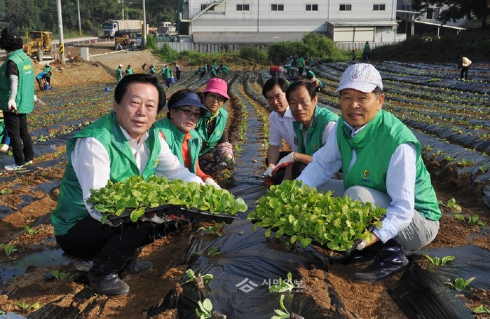 29일 새마을운동 광주시지회는 조억동 광주시장(좌측), 이원률 새마을지회장, 읍·면·동 남녀 새마을지도사 등 120명이 참여한 가운데 곤지암읍 삼리에 위치한 휴경지에서 어려운 이웃돕기 배추심기 행사를 펼쳤다. (사진제공=광주시청)