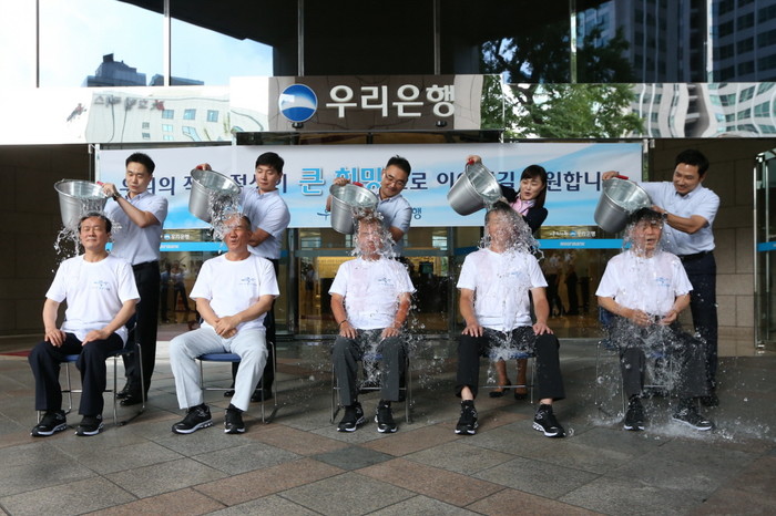 29일 우리은행 본점 로비에서 열린 이번행사는 최근 지인으로부터 지명을 받은 전임 이종휘 은행장의 제안으로 김진만, 이덕훈, 황영기 역대 은행장들이 동참의 뜻을 밝혔고, 마침 우리은행 한새여자농구단 위성우 감독으로부터 지명을 받은 이순우 은행장도 환자들의 쾌유를 빌며, 이러한 취지가 금융권 전반으로 확대되기를 기원하는 마음에서 참여하기로 함에 따라 전·현직 은행장들이 모여 시원한 얼음물 세례를 받게 됐다.