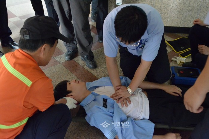 지난달 28일 서울 영등포소방서는 영등포역에서 추석을 앞두고 전기배전반에서 화재가 발생하는 것을 가정한 화재진압훈련과 소방안전교육을 실시했다. 사진은 화재로 인해 심장이 멈춘 것을 가정하고 심폐소생술을 진행하는 영등포역 자체소방대원들의 모습. (사진제공=영등포소방서)