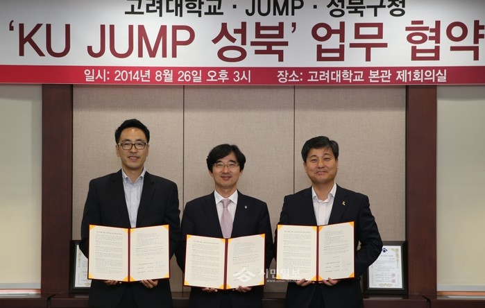 서울 성북구가 고려대학교 대외협력처, 비영리 소셜벤처 '점프(Join Us Maximize our Potential)'와 함께 'KU JUMP 성북' 멘토링 사업을 위해 지난달 26일 고려대학교에서 협약식을 했다. 사진은 김영배 성북구청장(오른쪽), 김상용 고려대학교 대외협력처장(가운데), 이의헌 JUNP 대표(왼쪽)가 기념촬영을 하는 모습. (사진제공=성북구청)