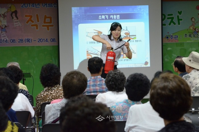 지난 29일 서울 영등포소방서가 영등포구 신길동 영등포종합사회복지관에서 100여명의 노인들을 대상으로 화재가 발생했을 때의 대피 요령과 소화기사용법 등의 내용으로 구성된 소방안전교육을 실시했다. 사진은 강사가 소화기 사용법을 교육 중인 모습. (사진제공=영등포소방서)