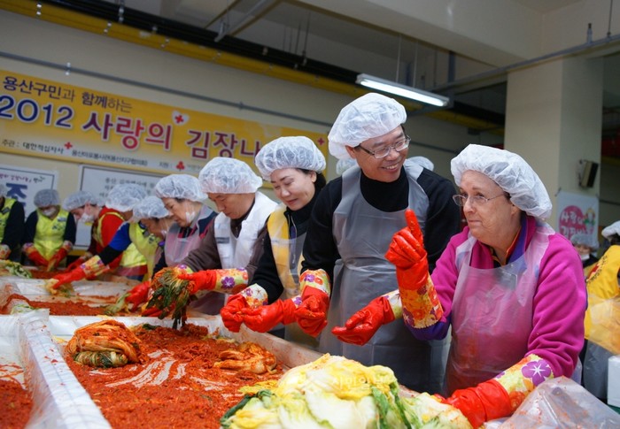 | ▲ 남영동 갈월복지관에서 진행된 '사랑의 김장 담그기' 행사에 참가한 성장현 구청장(오른쪽에서 두번째)이 대화를 나누며 김치를 담그고 있다. | ||