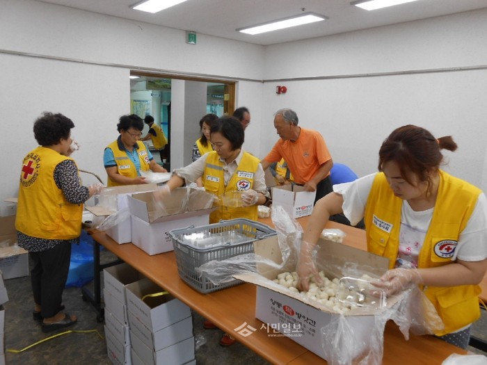 지난 1일 대한적십자 양동면 봉사회가 경기 양평군 양동면에 거주하는 홀몸노인 등 100가구에 지역내 단체, 개인들이 모은 쌀과 성금으로 사랑의 송편을 전달했다. 사진은 송편을 전달하기 위해 준비 중인 봉사회원들의 모습. (사진제공=양평군청)