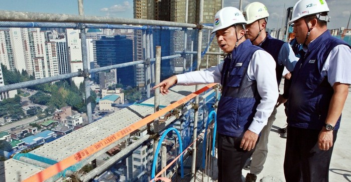 | ▲ 지난 1일 공덕파크자이 현장을 방문한 임병용 GS건설 사장이 현장 안전 관리 상태를 점검하고 있다. (GS건설 제공) | ||