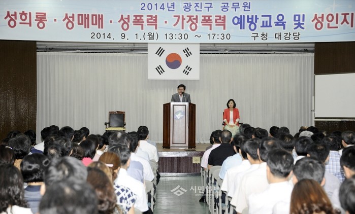 지난 1일 서울 광진구 구청 대강당에서 '건강한 직장 분위기 조성'을 위해 전직원을 대상으로 개최한 '성희롱 예방 및 성인지 교육'에 앞서 김기동 광진구청장이 직원들에게 인사말을 전하고 있다. (사진제공=광진구청)