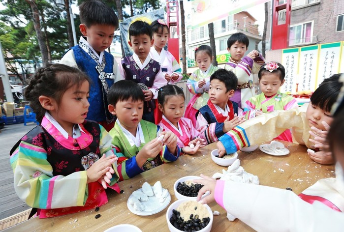 4일 서울 중구 신당5동 주민센터와 유락사회복지관이 중구 다산어린이공원(중구 신당동 다산로 42)에서 개최한 한가위 축제에 참여한 신당5동 어린이집 원생 20여명이 추석 차례상 송편을 만들고있다.(사진제공=중구청)