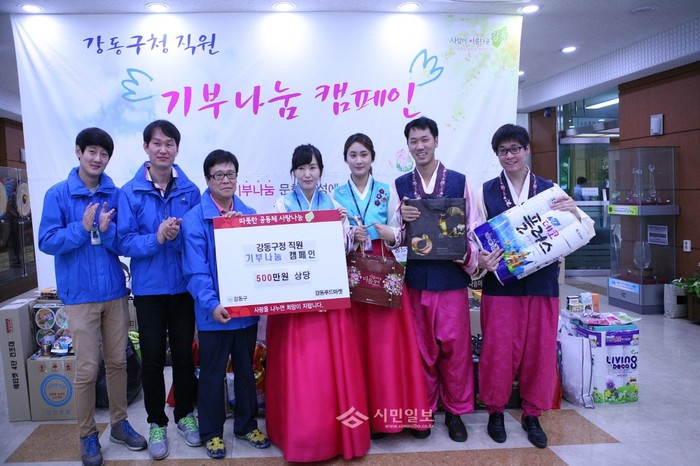 4일 서울 강동구청 직원들이 추석을 맞아 1200여명의 전직원이 쌀, 라면, 통조림을 포함한 식료품과 칫솔, 휴지 등 500만원 상당의 생활용품을 모아 강동푸드마켓에 기부했다. 사진은 강동푸드마켓에 물품을 전달한 2014년 임용된 강동구 새내기 직원들의 모습. (사진제공=강동구청)