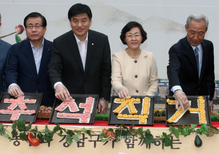 지난 2일 서울 강남구청 주차장에서 열린 ‘2014 우리 농수축산물 직거래 장터’에서 풍성한 한가위를 기원하는 송편 시식행사에 신연희 강남구청장(왼쪽)이 참여하고 있다. (사진제공=강남구청)