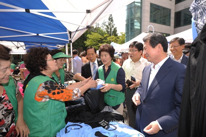 4일 오전 중랑구청 앞 광장에서 개최된 새마을 부녀회 ‘녹색 나눔 장터’에 참석한 나진구 중랑구청장(오른쪽)이 새마을 부녀회원들을 격려하고 있는 모습. 구는 이번 행사를 통해 얻어지는 수익금을 지역내에 취약 계층을 위한 복지사업에 사용할 예정이다. (사진제공=중랑구청)