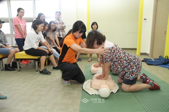 서울 은평소방서는 지난 3일 오전 시민안전체험교실 2층에서 은평뉴타운 어머니회 대표 김수미씨 등 20여명을 대상으로 심폐소생술 소방안전교육을 실시했다. 사진은 체험교실에 참가한 어머니 회원이 심폐소생술 교육 중인 모습. (사진제공=은평소방서)