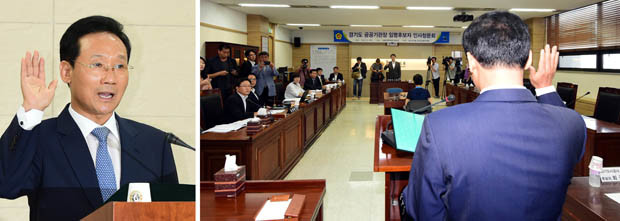 4일 오전 경기 수원 경기도의회에서 열린 경기도 공공기관장 인사청문회에서 최금식 경기도시공사 사장 임용 후보자가 선서하고 있다. 전국 최초로 열린 이번 인사청문회는 최금식 경기도시공사 사장 후보자를 시작으로 임해규 경기개발연구원장 후보자, 최동규 경기중기센터 대표 후보자, 조창희 경기문화재단 대표 후보자 등을 대상으로 진행된다.