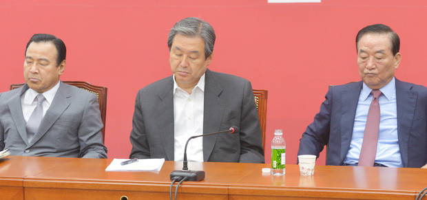 4일 오전 새누리당 최고위원회의가 열린 서울 여의도 국회 대표최고위원실에서 김무성 대표 등 지도부가 전 날 같은 당 송광호 의원의 체포동의안 부결에 대한 비판을 의식한 듯 굳을 얼굴로 자리하고 있다. 왼쪽부터 이완구 원내대표, 김무성 대표, 서청원 최고위원, 이인제 최고위원.
