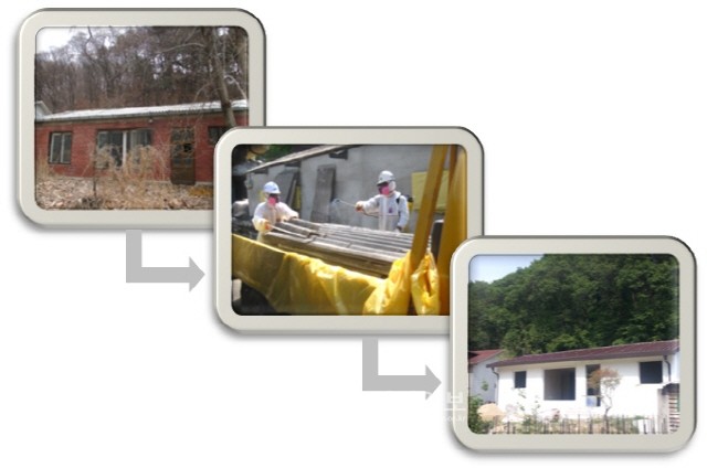 지원대상은 건축물대장상‘주택’이며, 지원금액은 올해의 경우 최대 2,880천원(단가:20,000원/㎡)이다. 지자체에 신청하여 철거 승인을 득한 후 고용노동부에서 지정된 석면해체 업체에 의해 장비를 착용·설치 후 안전하게 슬레이트가 처리된다.