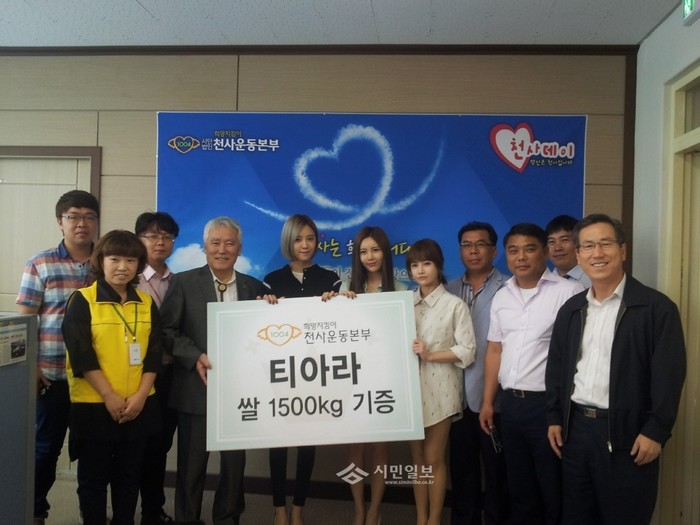 최근 경기 동두천시에 위치한 '(사)희망지킴이 천사운동본부' 사무실을 방문한 걸그룹 '티아라' 멤버들이 어려운 이웃들을 위해 사용되기를 바란다며 쌀 1500kg을 기증하고 기념촬영을 하고 있다. (사진제공=동두천시청)