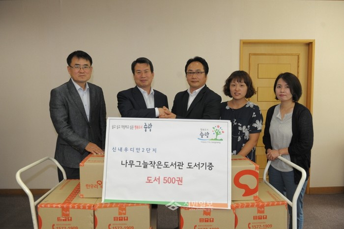 최근 서울 중랑구는 (사)한우리독서문화운동본부로부터 기증받은 500권의 도서를 지역내 신내우디안2단지 나무그늘작은도서관에 전달했다. 사진은 나진구 중랑구청장(왼쪽 두번째)과 이성순 나무그늘작은도서관장(오른쪽 첫번째) 등 관계자들이 기념촬영을 하는 모습. (사진제공=중랑구청)