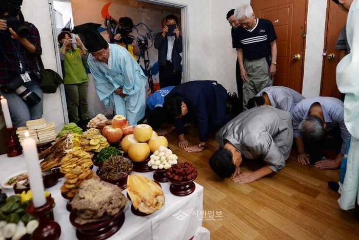 최근 서울 동대문구는 전농동 쪽방촌(성바오로병원 뒤)에서 열린 '추석 합동차례 행사'에 참석해 121가구 쪽방 주민을 격려했다. 사진은 유덕열 동대문구청장(가운데)이 성균관유도회의 안내를 받으며 합동차례를 지내고 있는 모습. (사진제공=동대문구청)