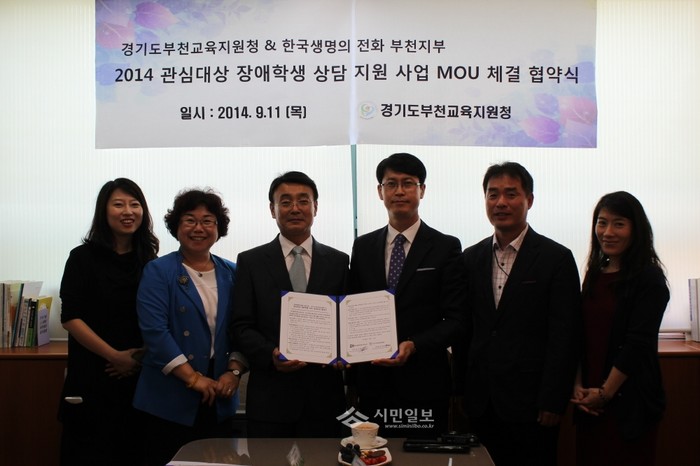경기도부천교육지원청은 관심대상 장애학생 인권보호와 관련해 상담 프로그램 지원을 위한 한국생명의 전화 부천지부와 업무협약(MOU) 체결식을 11일 열었다. 사진은 한영희 교육장, 신성재 소장 및 관계자가 MOU체결 후 기념촬영 모습. (사진제공=경기도부천교육지원청)