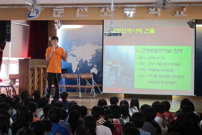 지난 12일 경기 군포소방서가 지역내 둔전초등학교를 방문해 5·6학년 학생 전원을 대상으로 안전사고 예방 및 초기대응, 버스사고 예방과 대처법 등을 내용으로 한 '체험학습 사전 안전교육'을 실시하고 있다. (사진제공=군포소방서)