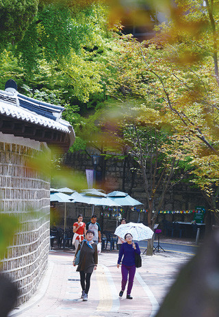 서울 낮 최고기온이 28도로 화창한 날씨를 보인 14일 오전 서울 중구 정동 덕수궁 돌담길을 시민들이 거닐고 있다.