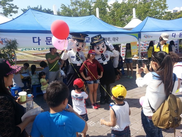지난 13일 경기 구리경찰서는 장자 호수공원에서 '구리시 다문화 가족지원센터'가 주관하는 '세계인의 날' 행사장을 방문해 지역내 결혼이주여성과 이주노동자들을 위한 범죄예방 이동부스를 운영했다. 사진은 행사참가자들과 기념촬영 중인 포돌이, 포순이의 모습. (사진제공=구리경찰서)