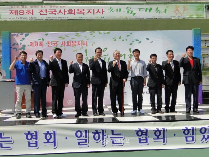 최근 충남 아산시 이순신 종합운동장에서 전국 사회복지사들의 자긍심을 고취하고 상호 교류·화합을 도모하기 위해 한국사회복지사협회가 주최하고 도사회복지협회가 주관하는 '제8회 전국사회복지사 체육대회'가 성황리에 열렸다. 사진은 복지사협회 관계자들이 기념촬영한 모습. (사진제공=아산시청)