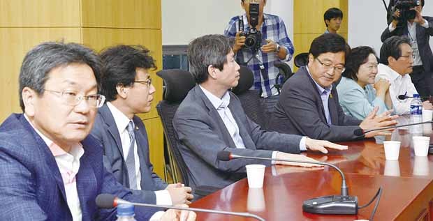 새정치민주연합 박영선 국민공감혁신위원장 겸 원내대표의 사퇴를 촉구한 최재성, 유승희 의원 등 15인 모임은 15일 오전 서울 여의도 국회 의원회관 제8회의실에서 대책을 협의하고 있다.