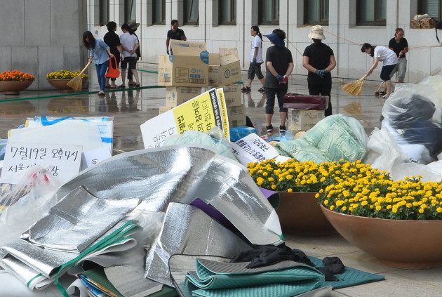 세월호 유가족들 농성장 청소