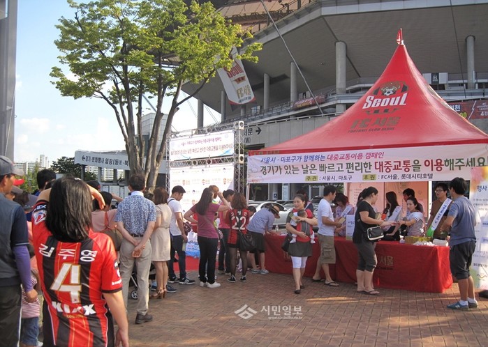 최근 서울 마포구와 서울시가 주관하고 FC서울, 롯데시티호텔이 후원한 가운데 서울월드컵경기장을 찾은 시민들을 대상으로 열린 '대중교통이용 캠페인' 부스에서 아이스물병 등을 나눠주고 있다. (사진제공=마포구청)