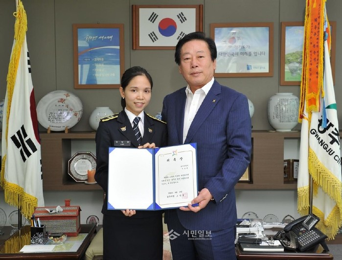 경기 광주시는 지난 15일 지역내에 성공적으로 정착한 결혼이민자를 발굴, 어려운 다문화가정을 발굴해 지원하도록 연계하고 희망 강연활동과 광주시 다문화정책 홍보활동을 펼칠 '광주시 명예 다문화가정 서포터'를 위촉했다. 사진은 이보은 순경과 조억동 광주시장이 위촉식 후 기념촬영을 하는 모습. (사진제공=광주시청)