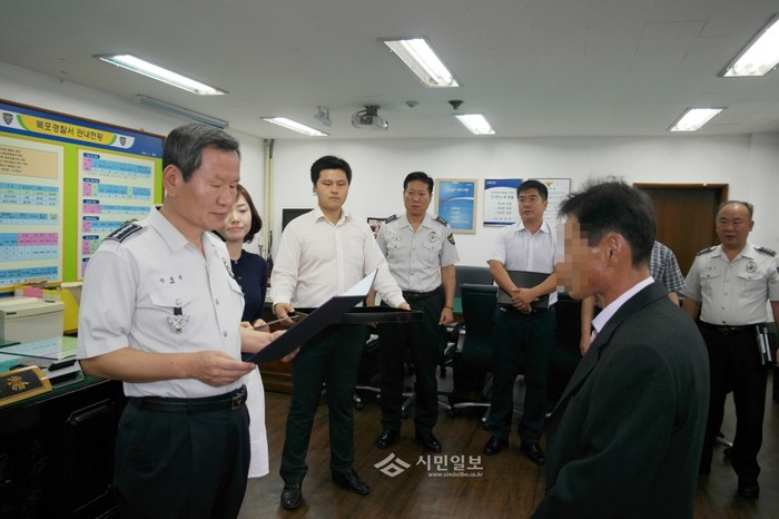전남 목포경찰서가 17일 심야에 목포시 영산로 노상에서 정차 중인 30대 K모 여성 차량에 탑승해 운전자를 폭행한 후 강제로 추행한 피의자 검거에 결정적인 역할을 한 장 모씨(57)에게 감사장과 신고포상금을 지급하고 격려했다.