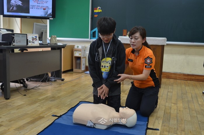 18일 서울 강남소방서가 강남구 개포동에 위치한 개일초등학교를 방문해 119소년단 20여명을 대상으로 심폐소생술 교육을 실시했다. 사진은 소방관의 지도 아래 심폐소생술 실습 중인 학생의 모습. (사진제공=강남소방서)