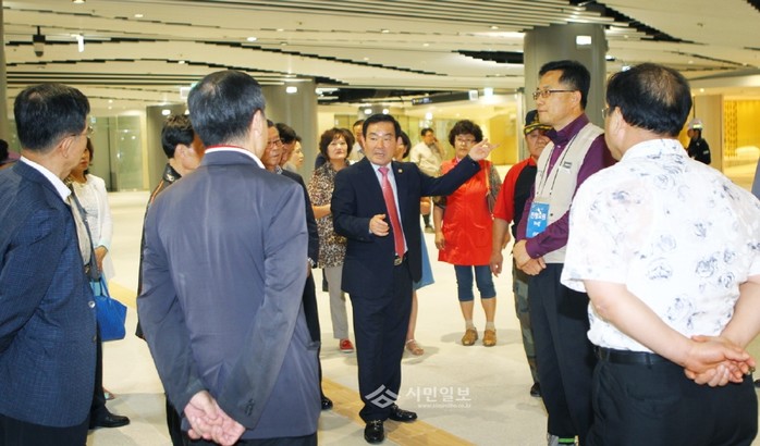 | ▲ 제2롯데월드 프리오픈 현장을 방문한 임춘대 송파구의장이 내부를 살펴보며 문제점을 지적하고 있다. (사진제공=송파구의회) | ||