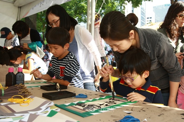 | ▲ 육의전 체험축제에 참여한 어린이가 '지전(한지가게)'에서 붓글씨를 쓰는 모습. (사진제공=종로구청) | ||