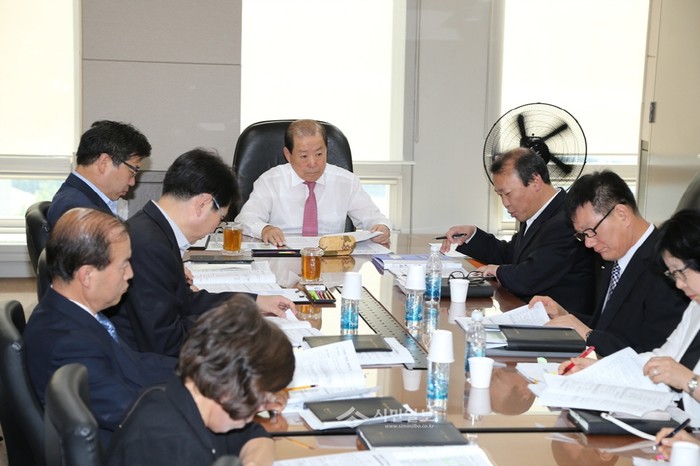 지난 19일 구청집중회의실에서 열린 '2015년도 주요업무보고회'에 참석한 박홍섭 마포구청장(가운데)이 김경한 부구청장, 기획재정국과 시설관리공단의 과장, 팀장, 실장들에게 각 부서 핵심사업 및 특수시책등을 보고 받고 있다. (사진제공=마포구청)