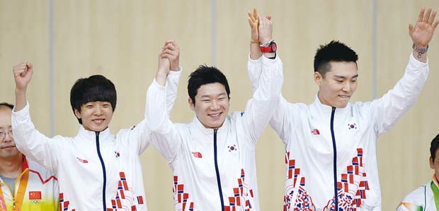 21일 오전 인천 옥련국제사격장에서 열린 2014 인천아시안게임 남자 사격 10m공기권총 단체전에서 금메달을 차지한 (왼쪽부터)김청용, 진종오, 이대명이 시상대에 올라 기뻐하고 있다. 남자 공기권총 대표팀은 진종오, 이대명, 김청용으로 구성 1744점 기록으로 1위를 확정했다.